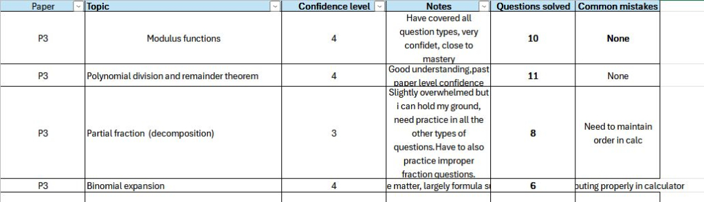 This will be your central progress tracker that will be of great use near exam time, be sure to honestly and frequently update this every 4 days. Feel free to adjust the fields based on the subject, for example for Economics you can substitute the ‘Questions solved’ with “Essay questions completed (8 marker + 6 marker)”. After you have made this the final in the decompilation process begins.